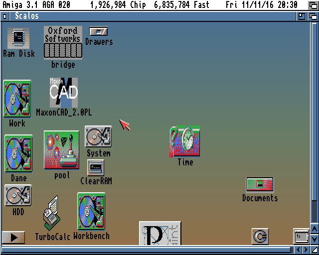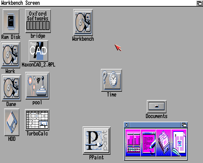 Powskakiwały powyciągane ikonki, widać dyski Work i Dane. Na dyskach są pliki, wszystko z grubsza działa. Niestety Workbench ciągle jest NDOS, nie ma sekwencji startowej i nie ma polskich znaków i klawiatury. I wcale nie pamiętam jak te polskie znaki zrobić 🙂