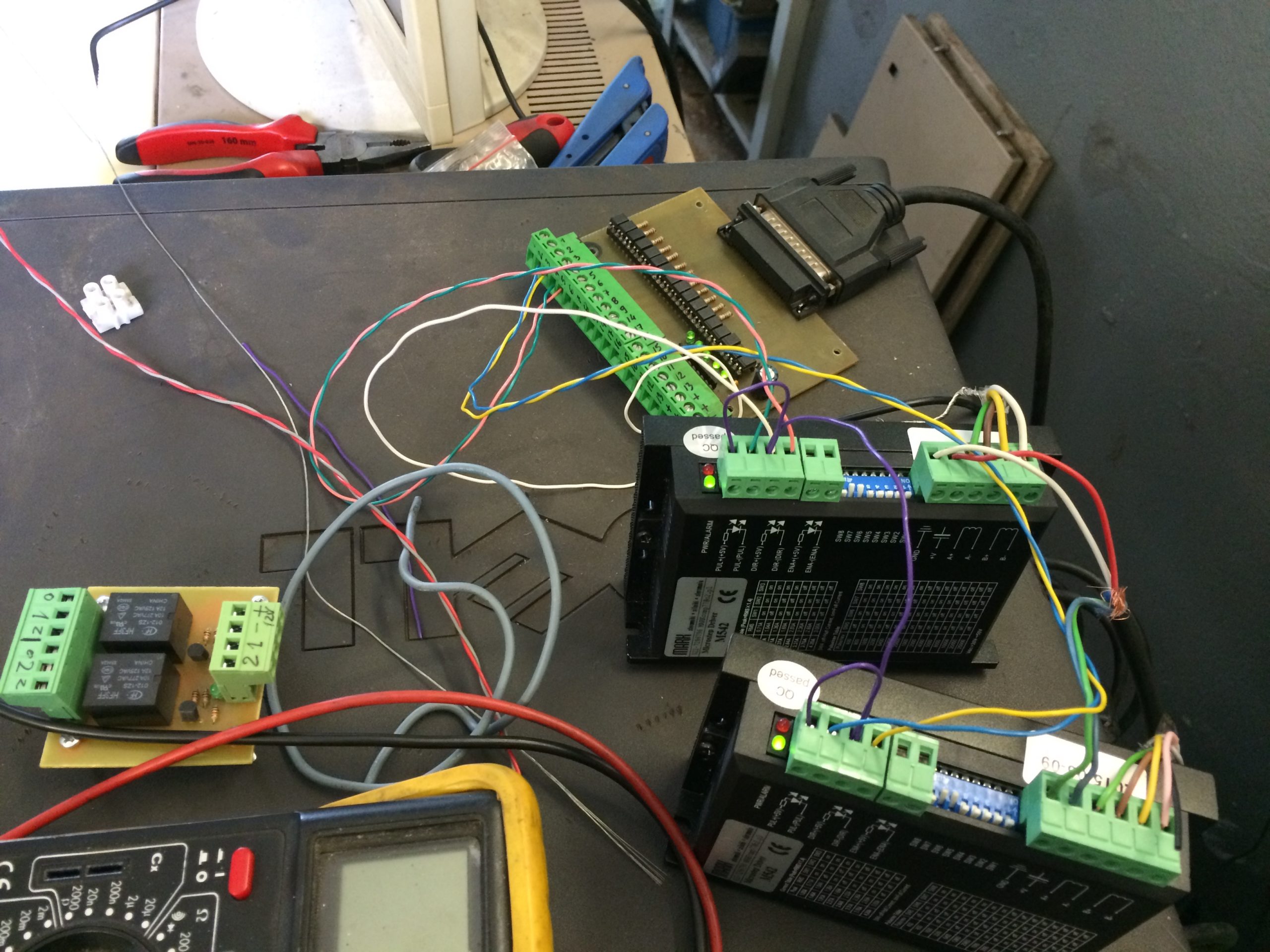 Potem postawiliśmy obok współczesny komputer z LinuxCNC, podmieniliśmy silniki krokowe na obu osiach na 4,5Nm i wysterowaliśmy je z 'pająka’ poskładanego z opto-BoBa, dwóch sterowników M452, i modułu z dwoma przekaźnikami.