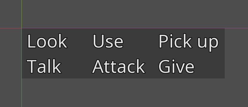 Interfejs sobie wymyśliłem staroszkolny - klasyczne 9-verbs tylko w moim przypadku będzie ich 6. Nie będzie 'push' i 'pull', zamiast tego będzie 'attack'.